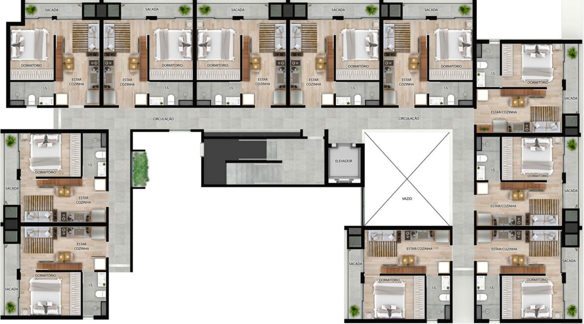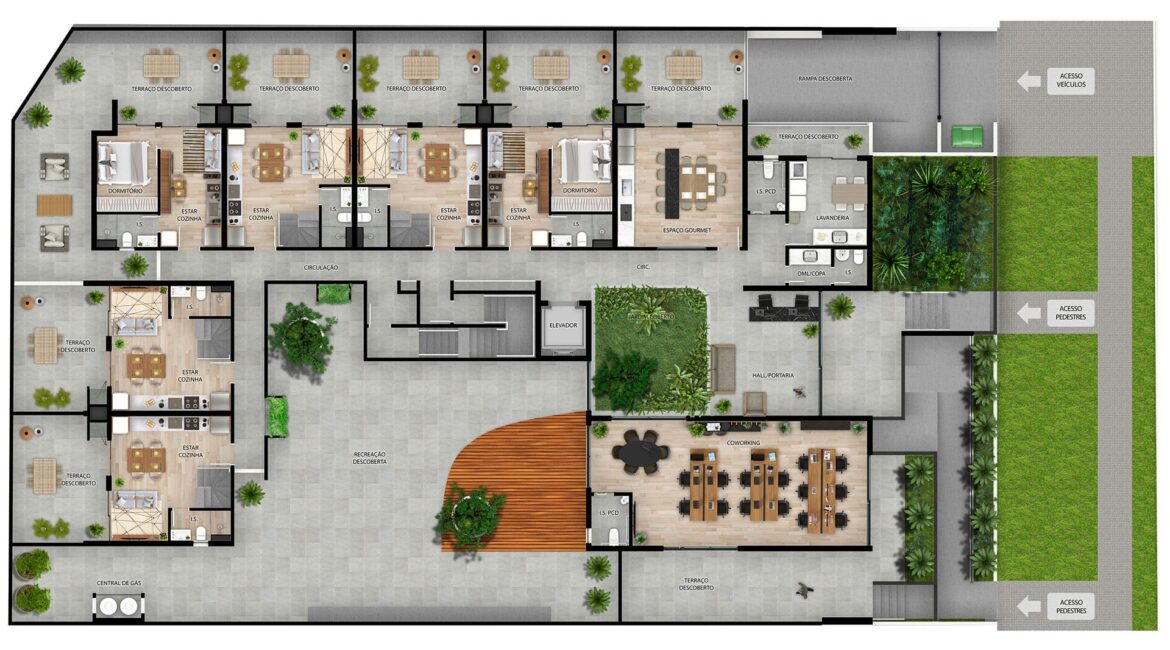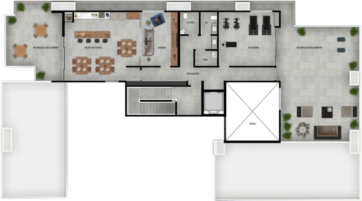 APARTAMENTOS COM PÉ DIREITO DE 3,6m E ESPAÇOS COMUNS COM PERSPECTIVAS QUE INTEGRAM VISUAIS.